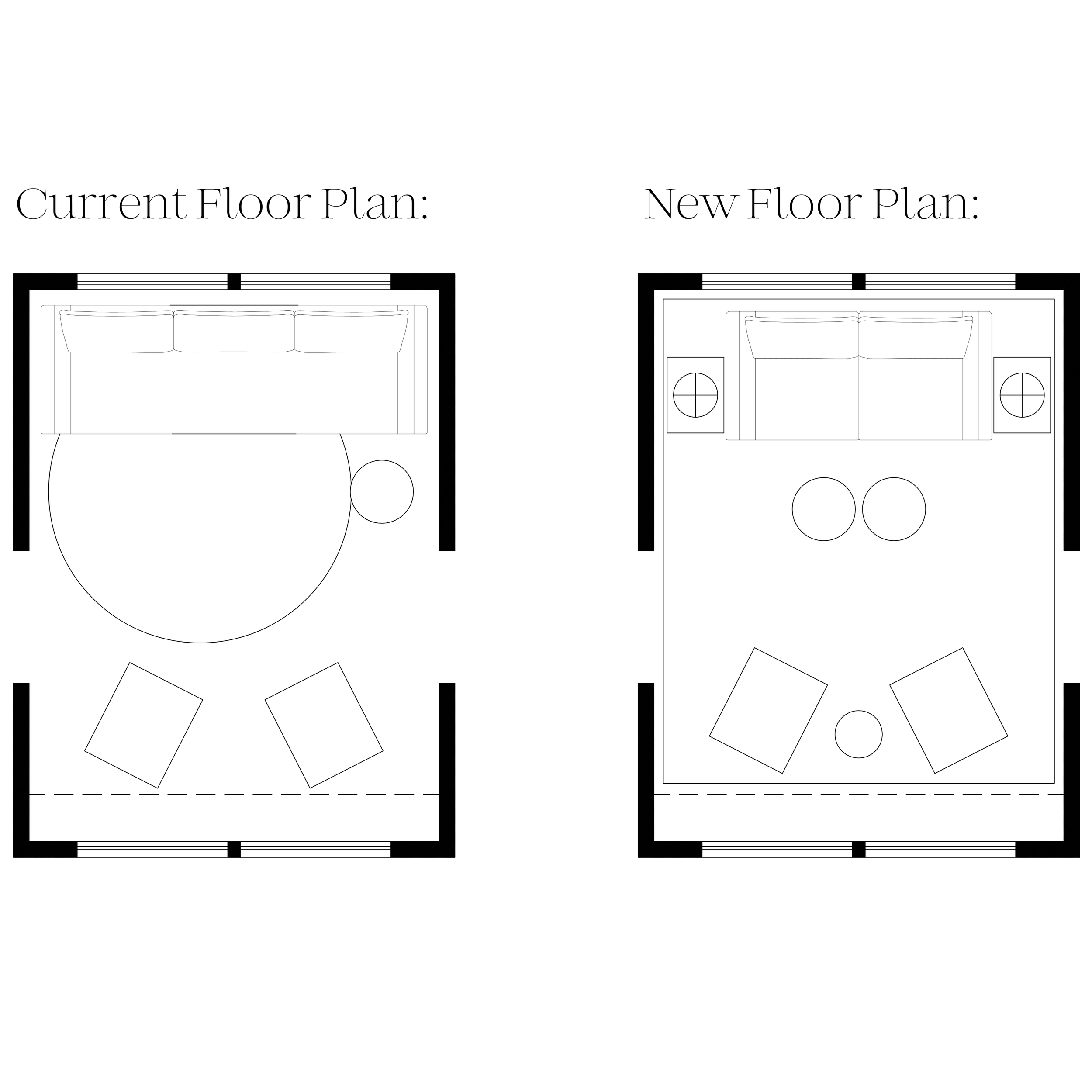 The client currently has a small rug that sits only on the sofa side of the room. Instead of grounding the space, it actually highlights the imbalance, visually weighting one half of the room and leaving the other side feeling unfinished and detached. There’s nothing tying the two sides together, so the circulation path feels less like an intentional design move and more like a dividing line.